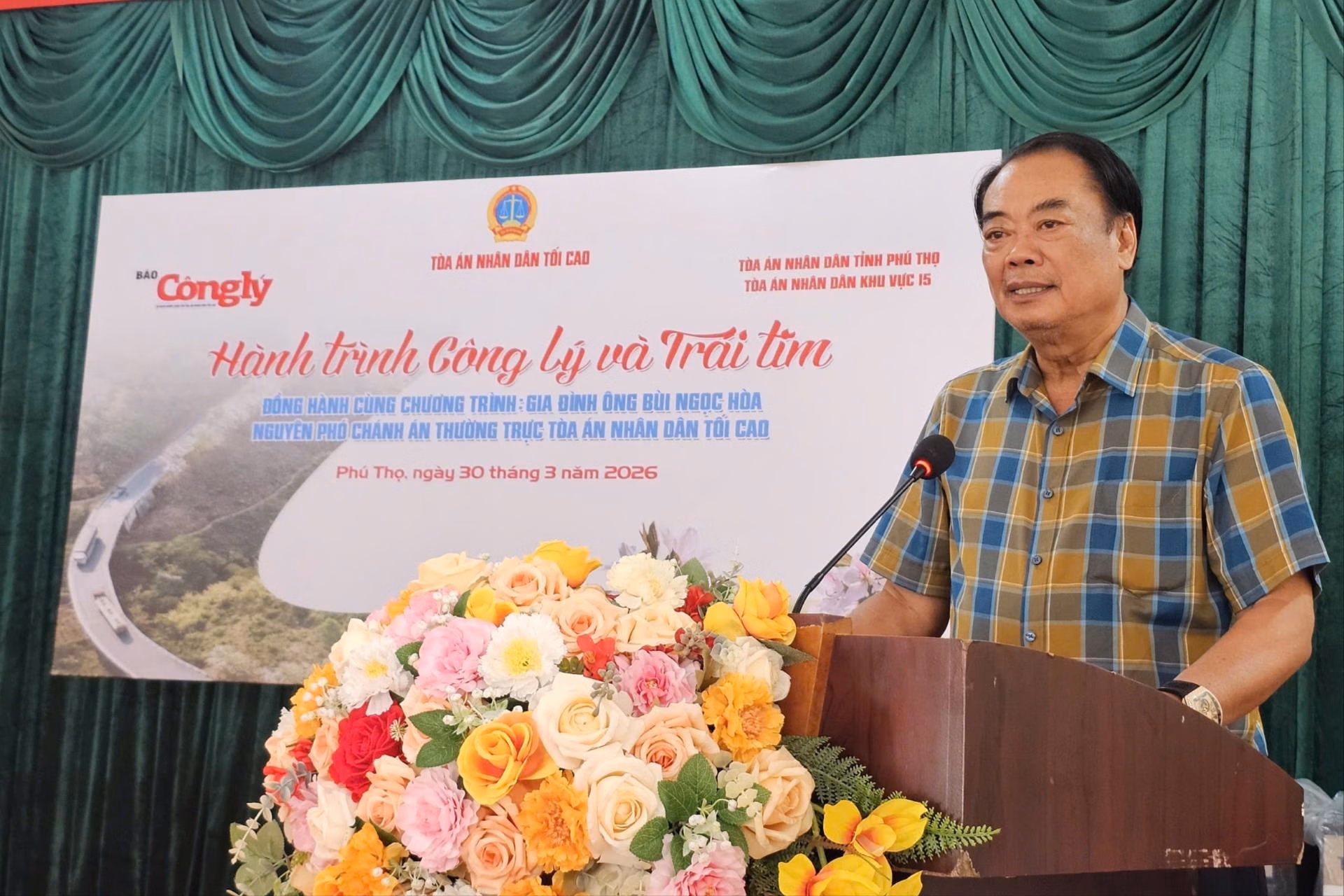 Phát biểu tại chương trình, ông Bùi Ngọc Hòa, nguyên Phó Chánh án Thường trực TANDTC, bày tỏ xúc động khi được đồng hành cùng Báo Công lý mang những phần quà ý nghĩa đến với người dân. Đây là sự sẻ chia chân thành, mong muốn giúp các gia đình có thêm động lực vượt qua khó khăn, ổn định cuộc sống.