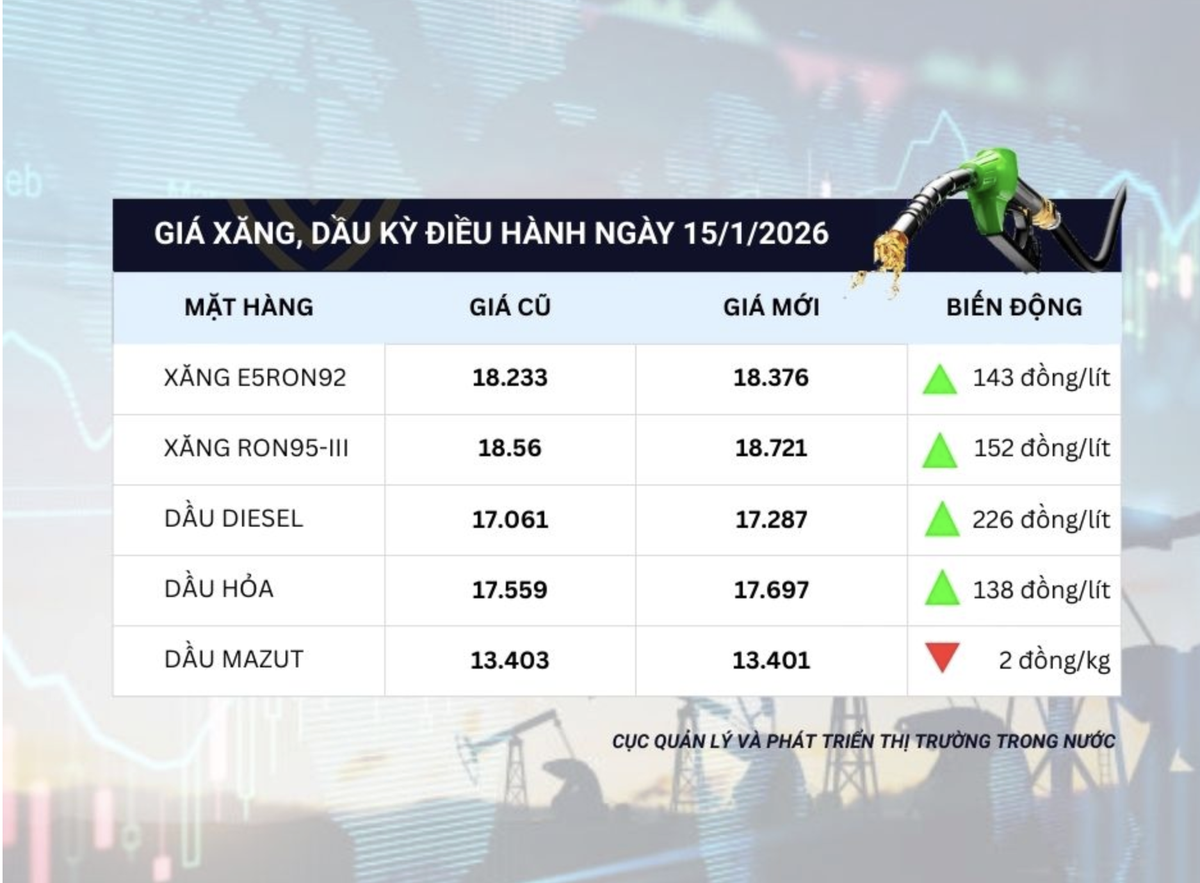 Cập nhật giá xăng dầu trong nước áp dụng từ ngày 15/01/2026