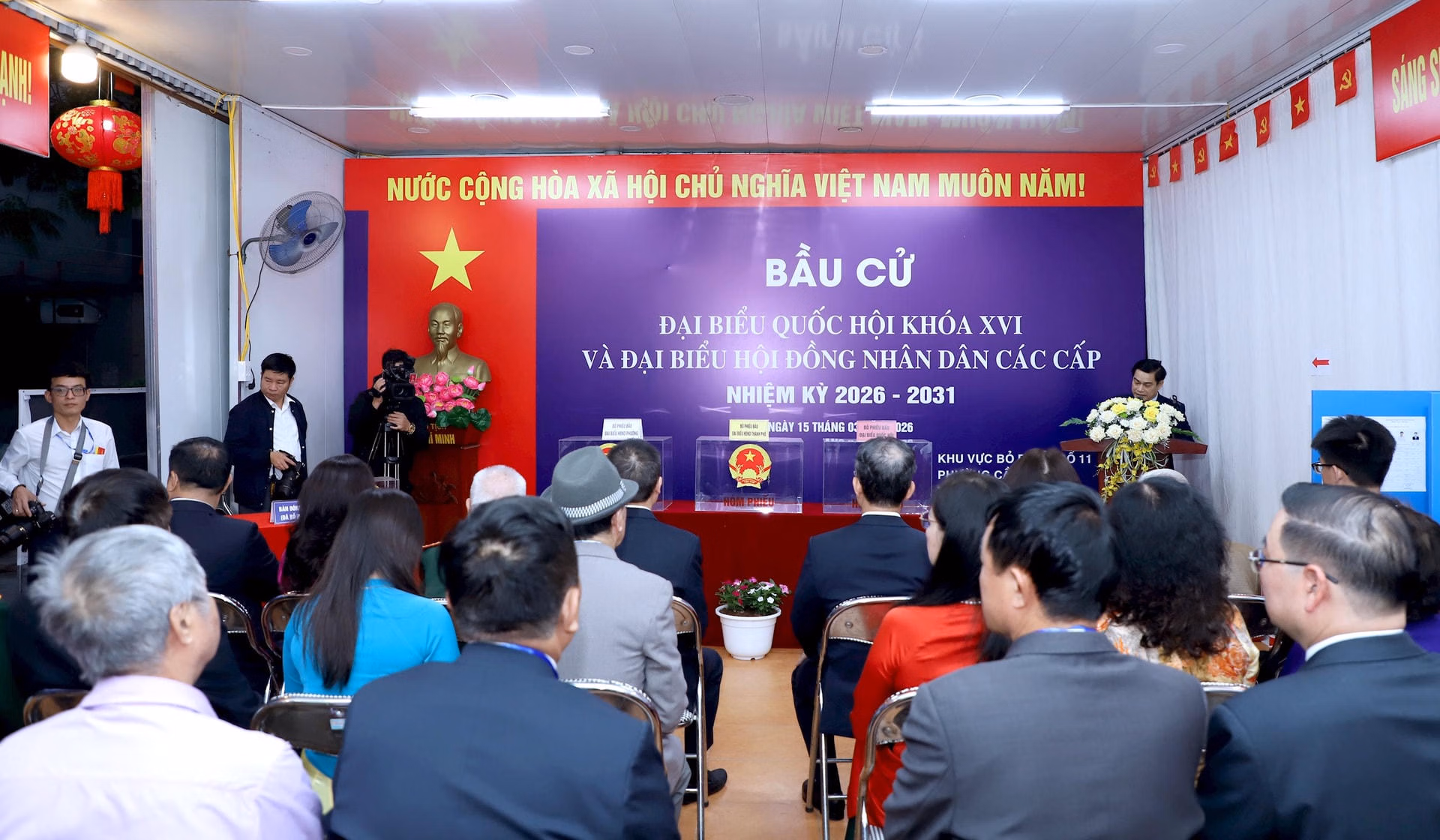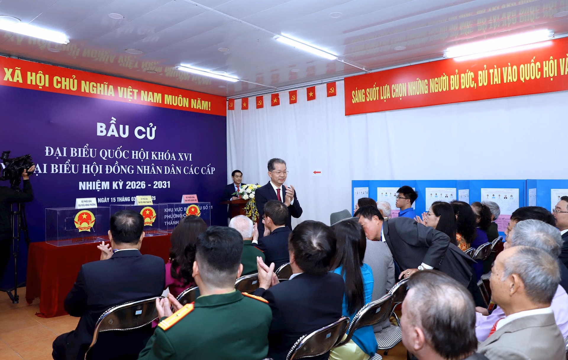 Tại Khu vực bỏ phiếu số 11 (ngõ 36 đường Duy Tân, phường Cầu Giấy), không khí ngày bầu cử diễn ra rộn ràng, trang trọng. Cờ đỏ, băng rôn và khẩu hiệu được trang hoàng khắp khu vực, tạo nên không khí phấn khởi của ngày hội lớn.