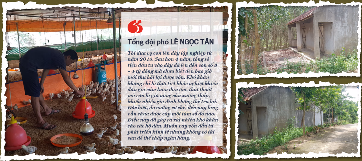 “Tôi đưa vợ con lên đây lập nghiệp từ năm 2018. Sau hơn 4 năm, tổng số tiền đầu tu vào đây đã lên đến con số 3 – 4 tỷ đồng mà chưa biết đến bao giờ mới thu hồi lại được vốn. Khó khăn không chỉ là thời tiết khắc nghiệt khiến đàn gia cầm luôn đau ốm, thất thoát mà còn là giá nông sản xuống thấp, khiến nhiều gia đình không thể trụ lại. Đặc biệt, do vướng cơ chế, đến nay làng vẫn chưa được cấp một tấm sổ đỏ nào. Điều này đã gây ra rất nhiều khó khăn cho các hộ dân. Muốn vay vốn đầu tư phát triển kinh tế nhưng không có tài sản để thế chấp ngân hàng” anh Tân nói.