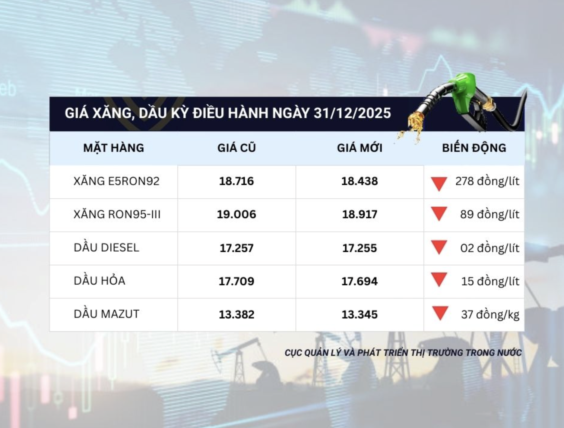 Trên cơ sở diễn biến giá thế giới và các quy định hiện hành, trong kỳ điều hành này, liên Bộ Công Thương – Tài chính không thực hiện trích lập và không chi Quỹ Bình ổn giá xăng dầu đối với tất cả các mặt hàng. Theo đó, kể từ 15h00 ngày 31/12/2025, giá bán lẻ tối đa đối với các mặt hàng xăng dầu được áp dụng theo mức giá cơ sở mới.