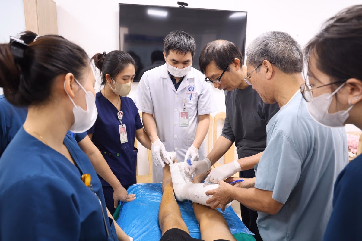 Tại buổi tái khám, các bác sĩ đã tiến hành tháo bột, rút chỉ, thay băng, kiểm tra vết mổ, đánh giá quá trình hồi phục và bó bột lại đối với những trường hợp cần tiếp tục cố định.