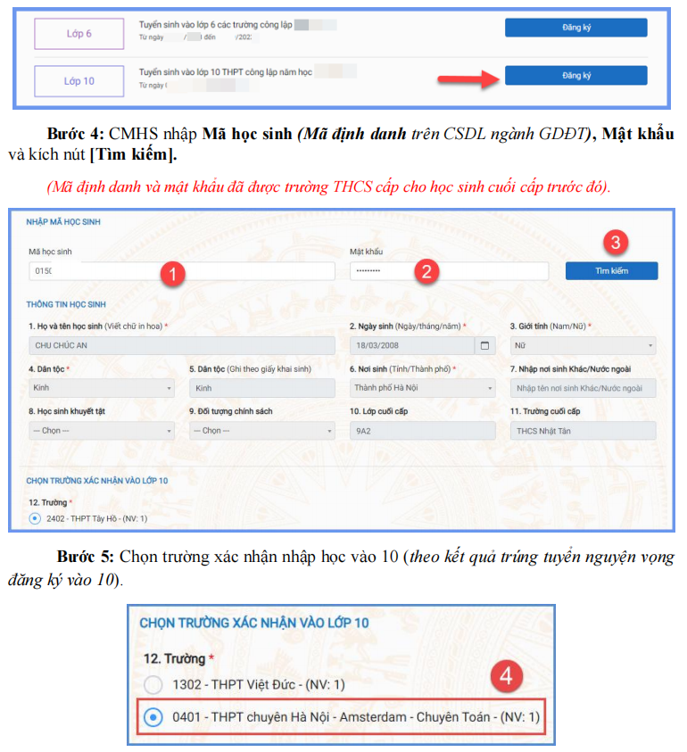 Sở Giáo dục và Đào tạo Hà Nội cho biết, học sinh có thể xác nhận nhập học theo hình thức trực tiếp (đến trường nơi có nguyện vọng trúng tuyển) hoặc trực tuyến, thông qua Cổng thông tin tuyển sinh đầu cấp của TP. Hà Nội, tại địa chỉ: https://tsdaucap.hanoi.gov.vn.