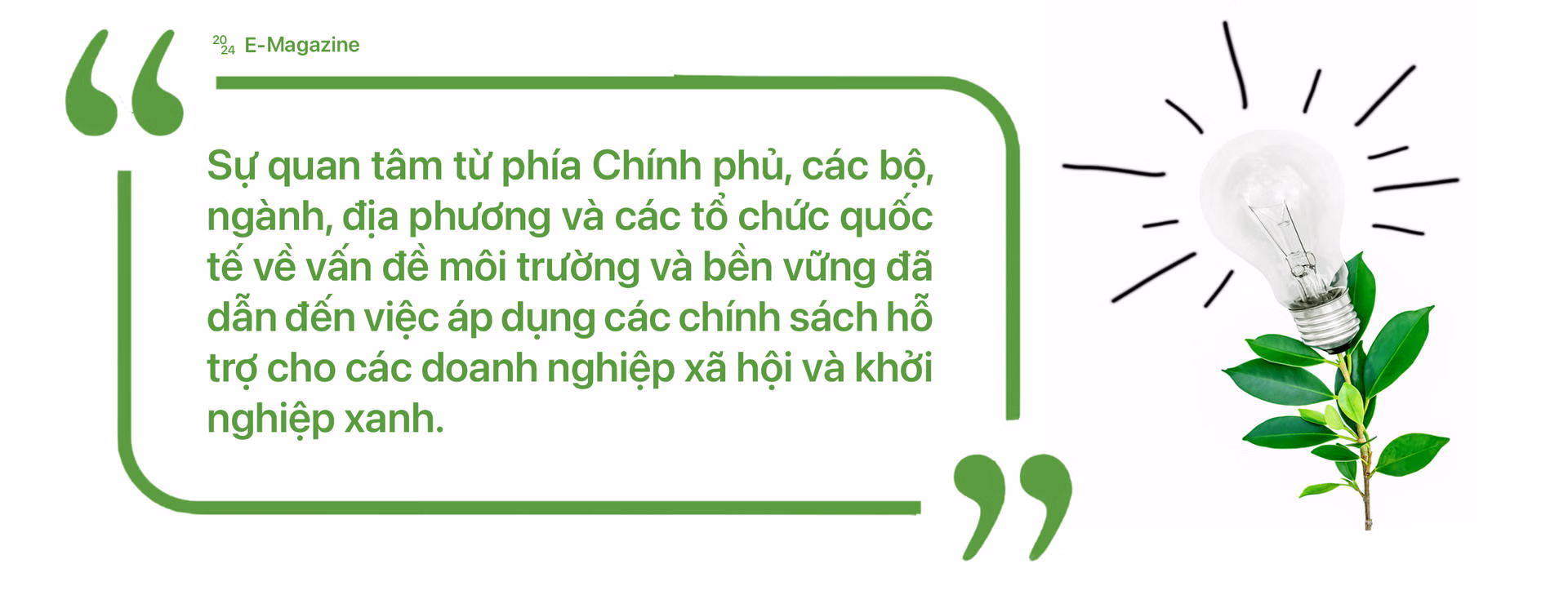 Sự quan tâm từ phía Chính phủ, các bộ, ngành, địa phương và các tổ chức quốc tế về vấn đề môi trường và bền vững đã dẫn đến việc áp dụng các chính sách hỗ trợ cho các doanh nghiệp xã hội và khởi nghiệp xanh. Các ưu đãi thuế, hỗ trợ tài chính và các chương trình khuyến khích khởi nghiệp đã tạo ra một môi trường thuận lợi cho sự phát triển của các doanh nghiệp này.