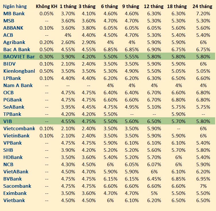 Ở các kỳ hạn dài 18-24 tháng, nhiều ngân hàng đẩy lãi suất lên cao. BVBank niêm yết 6,85% và 6,95%; Sacombank đạt 7,00% ở kỳ hạn 24 tháng; MB Bank cao nhất với 7,20%/năm. Ngược lại, một số ngân hàng như MSB giữ mức 5,30% cho toàn bộ các kỳ hạn dài.