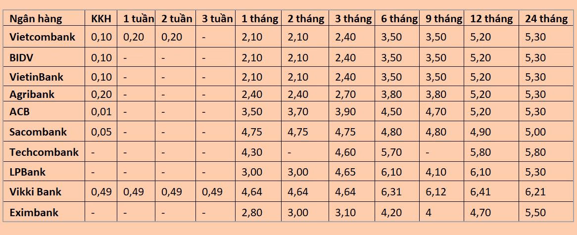 Trong khi đó, các ngân hàng thương mại cổ phần cho thấy mức lãi suất cạnh tranh hơn. ACB niêm yết 4,50%/năm cho kỳ hạn 6 tháng và 4,70%/năm cho kỳ hạn 9 tháng. Sacombank giữ mức ổn định quanh 4,75-4,80%/năm ở các kỳ hạn từ 1 đến 9 tháng.