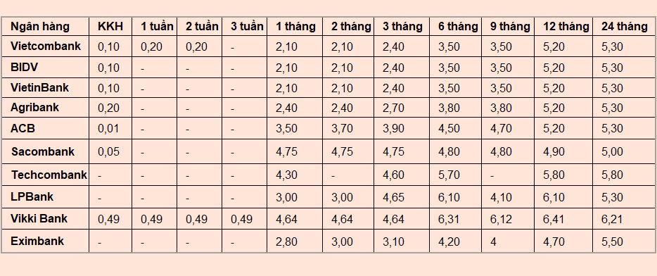 Ở kỳ hạn dài 24 tháng, lãi suất cao nhất là 6,21%/năm tại Vikki Bank; Techcombank 5,80%/năm; Eximbank 5,50%/năm; nhiều ngân hàng khác ở mức 5,30%/năm.