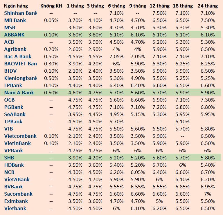 Trong khi đó, các kỳ hạn trung bình 6-9 tháng ghi nhận lãi suất phổ biến từ 3,5% đến trên 6,5%/năm. Một số ngân hàng như PGBank và Bac A Bank niêm yết mức trên 7%/năm ở kỳ hạn 6-9 tháng, cao hơn đáng kể so với mặt bằng chung.