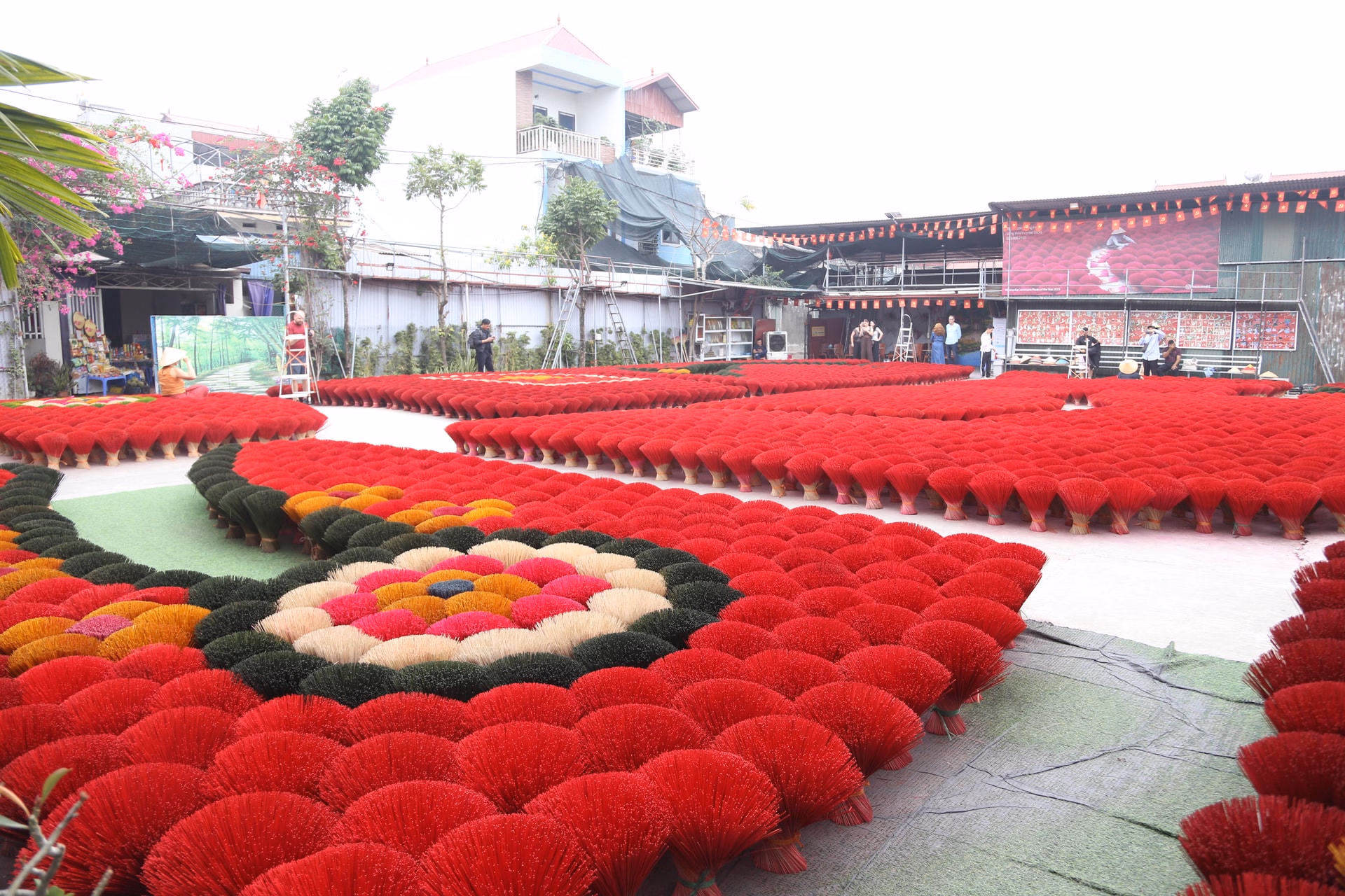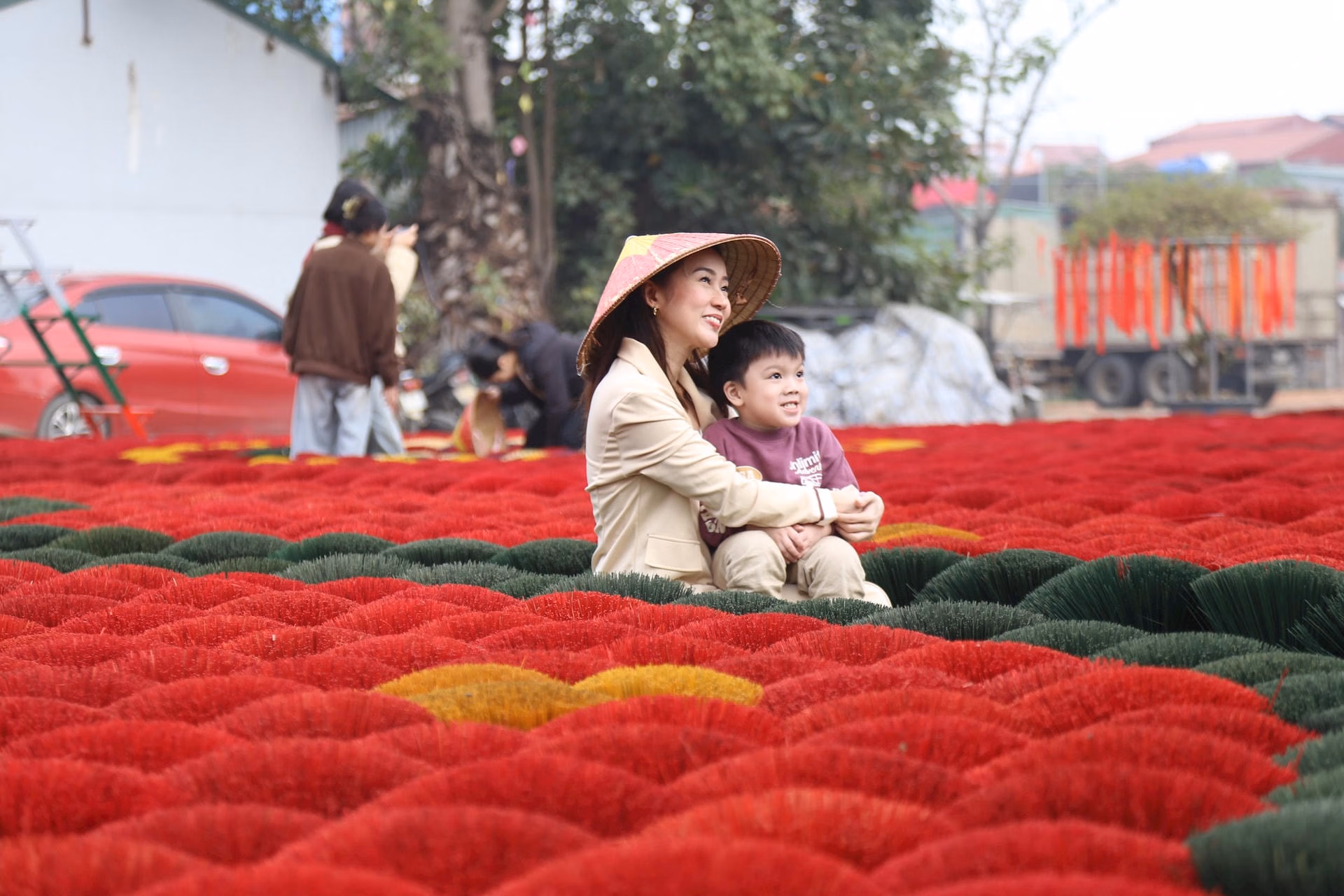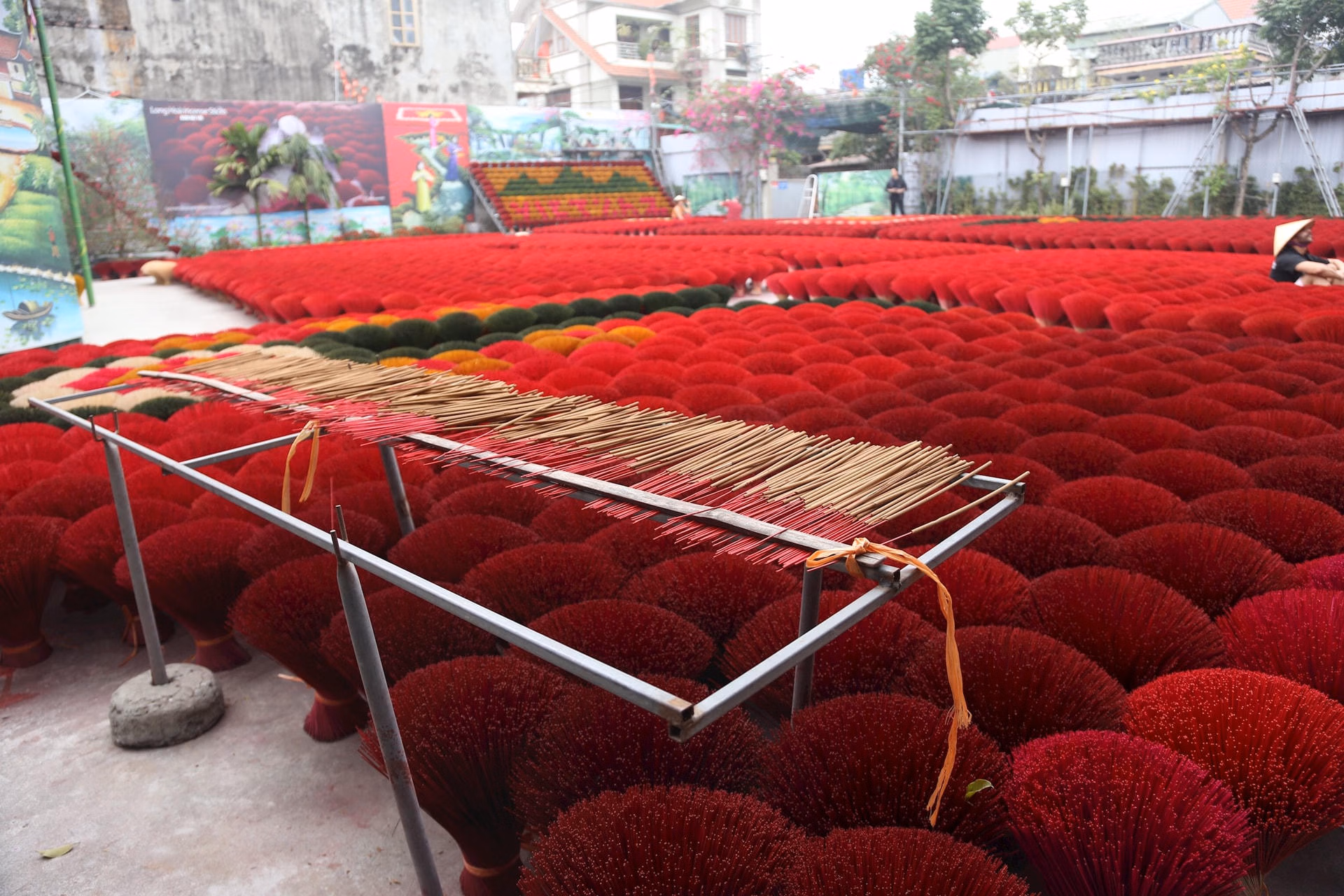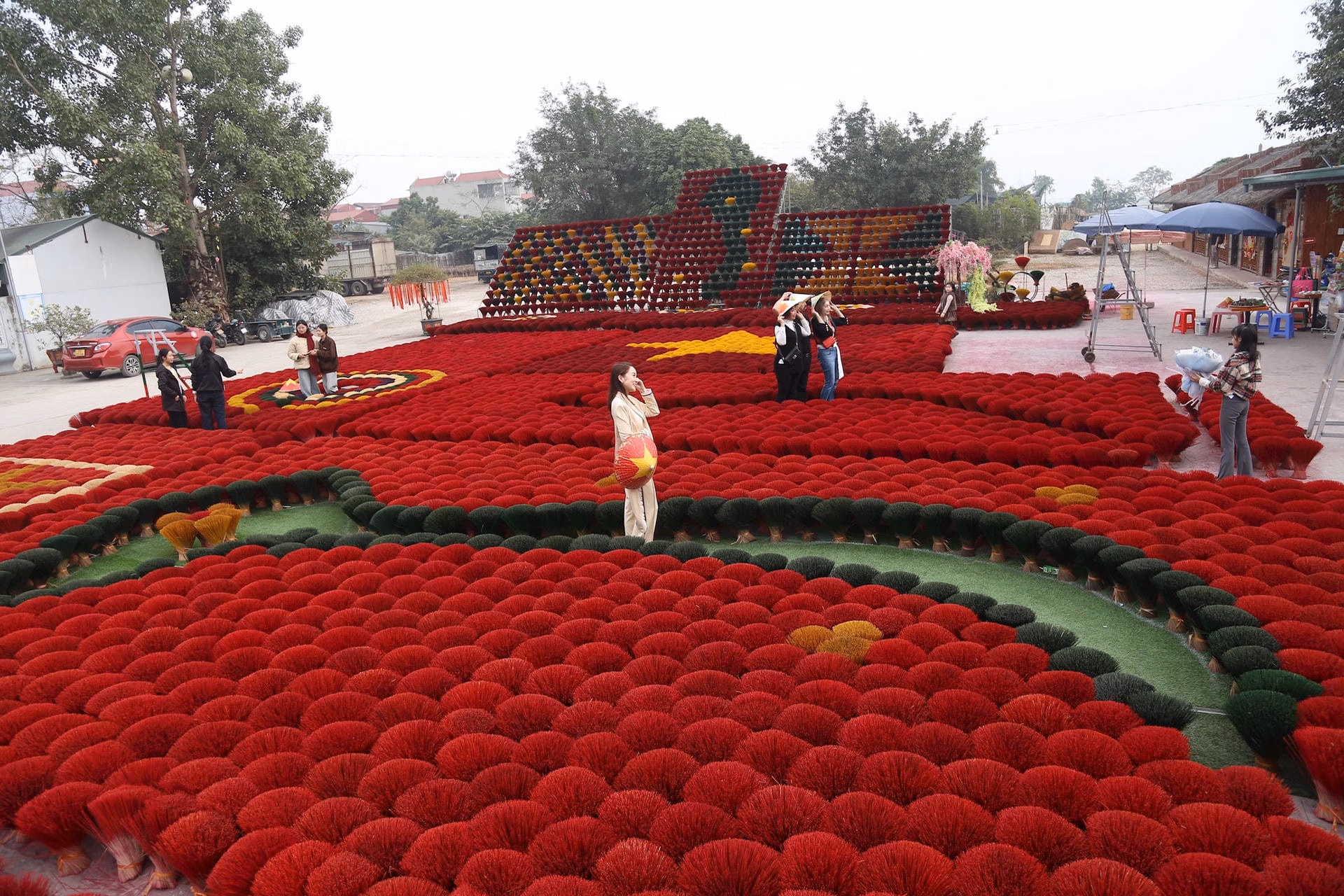 Mỗi độ Tết đến, xuân về, làng hương Quảng Phú Cầu như khoác lên mình tấm áo rực rỡ của sắc đỏ chân hương phơi đầy sân, đầy ngõ. Những bó hương xòe tròn như những đóa hoa khổng lồ dưới nắng, tạo nên khung cảnh vừa truyền thống, vừa đầy chất nghệ thuật, khiến bất cứ ai đặt chân tới cũng không khỏi trầm trồ.