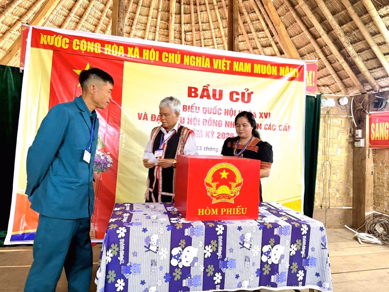 Ngay từ sáng sớm, đông đảo cử tri đã tập trung tại các điểm bầu cử. Tại khu vực bỏ phiếu số 25, thôn Đăk Mế, xã biên giới Bờ Y, không khí ngày hội diễn ra trang trọng, phấn khởi. Cờ hoa rực rỡ, các khâu tổ chức được chuẩn bị chu đáo, tạo điều kiện thuận lợi để người dân tham gia bỏ phiếu.