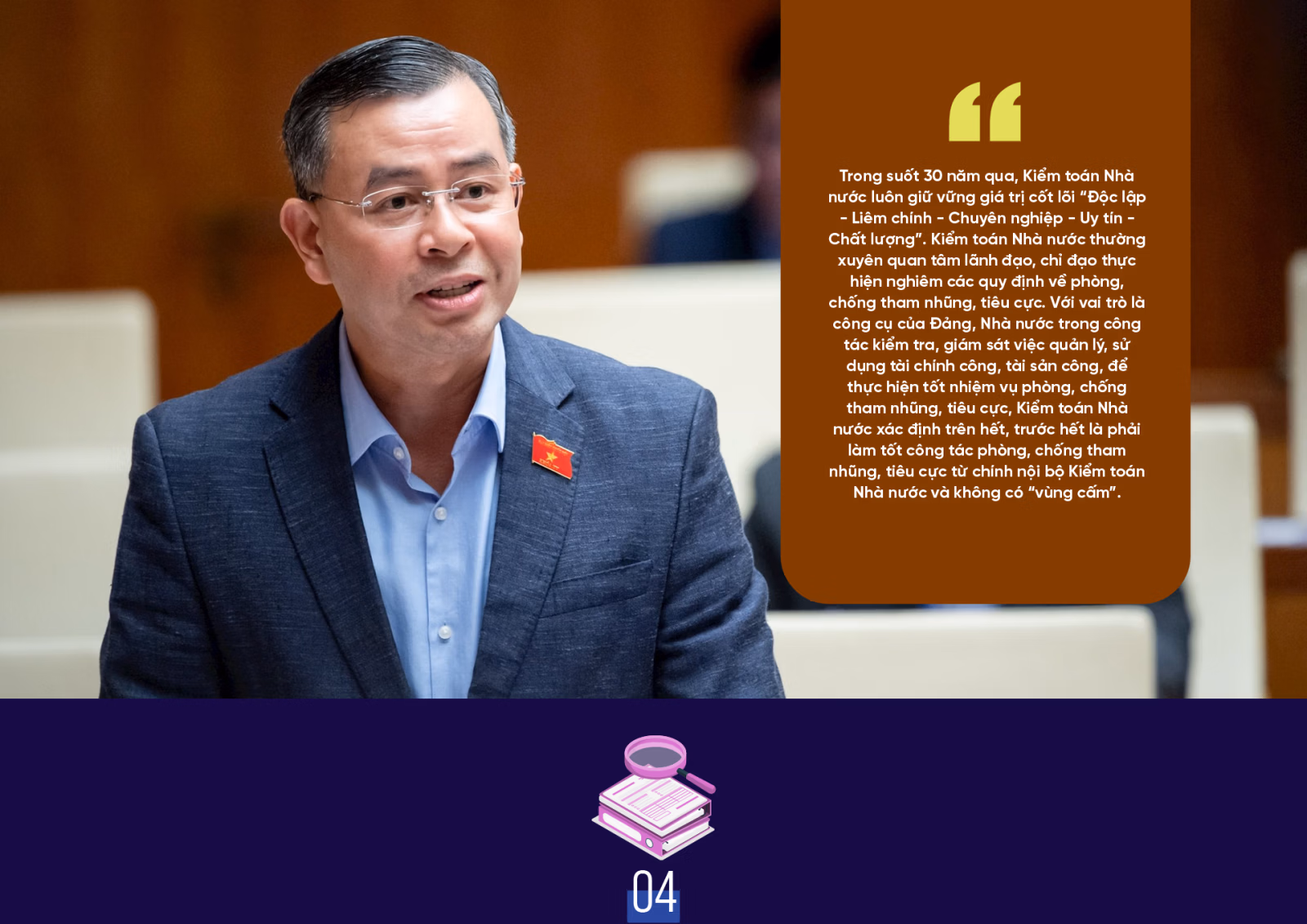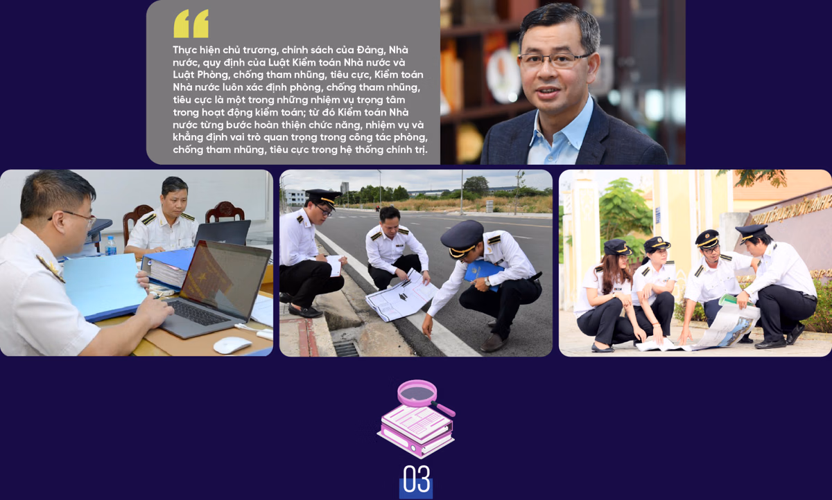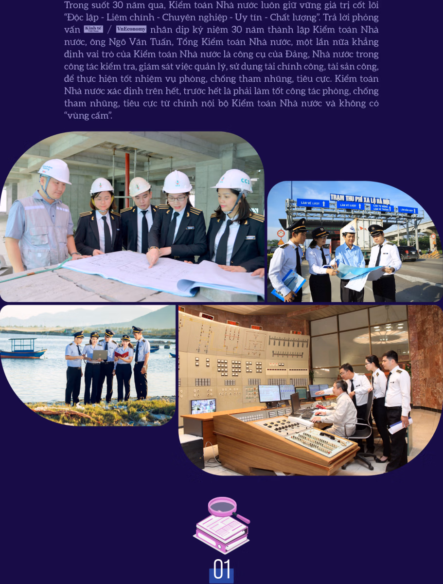 Trong suốt 30 năm qua, Kiểm toán Nhà nước luôn giữ vững giá trị cốt lõi “Độc lập - Liêm chính - Chuyên nghiệp - Uy tín - Chất lượng”. Kiểm toán Nhà nước thường xuyên quan tâm lãnh đạo, chỉ đạo thực hiện nghiêm các quy định về phòng, chống tham nhũng, tiêu cực. Với vai trò là công cụ của Đảng, Nhà nước trong công tác kiểm tra, giám sát việc quản lý, sử dụng tài chính công, tài sản công, để thực hiện tốt nhiệm vụ phòng, chống tham nhũng, tiêu cực, Kiểm toán Nhà nước xác định trên hết, trước hết là phải làm tốt công tác phòng, chống tham nhũng, tiêu cực từ chính nội bộ Kiểm toán Nhà nước và không có “vùng cấm”.