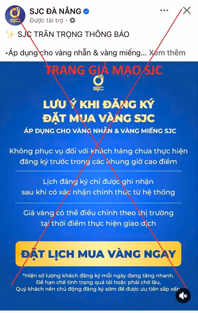 Theo thông tin từ SJC, thời gian gần đây xuất hiện hàng loạt fanpage giả mạo sử dụng tên gọi, hình ảnh và thương hiệu của doanh nghiệp như “SJC Hồ Chí Minh”, “SJC Đà Nẵng”… nhằm đánh lừa người tiêu dùng.
