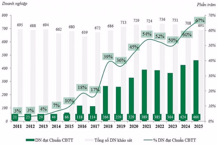 Đây là mức tỷ lệ cao nhất trong toàn bộ lịch sử 15 năm của chương trình IR Awards từ 2011 đến 2025. So với năm 2024, số lượng doanh nghiệp đạt chuẩn tăng thêm 36 đơn vị, tỷ lệ tăng từ 60% lên 67%, cho thấy xu hướng cải thiện mạnh và nhận thức cao hơn của các doanh nghiệp về vai trò và trách nhiệm của hoạt động công bố thông tin.