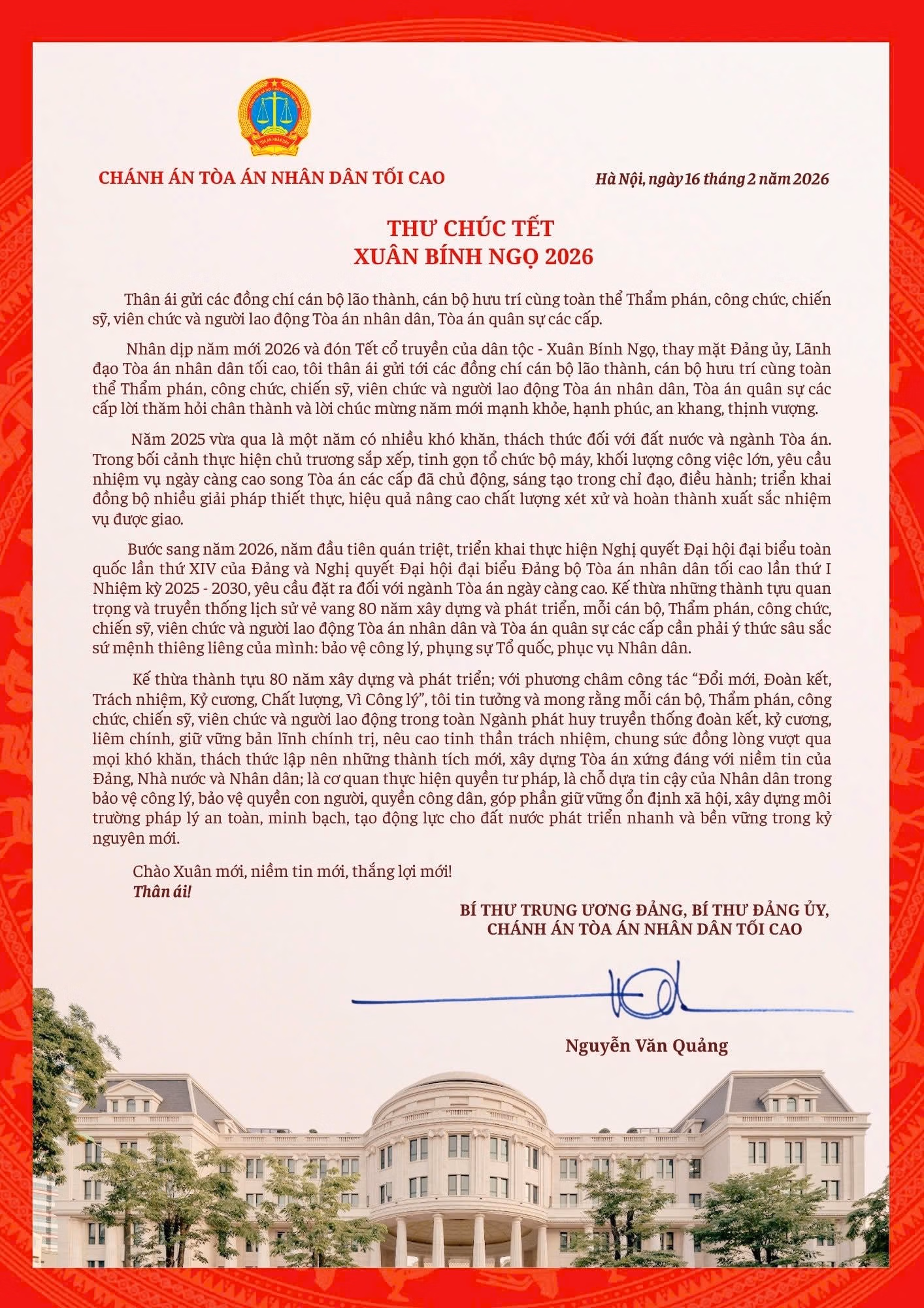 Nhân dịp năm mới 2026 và đón Xuân Bính Ngọ, Bí thư Trung ương Đảng, Bí thư Đảng ủy, Chánh án Tòa án nhân dân tối cao Nguyễn Văn Quảng đã gửi Thư chúc Tết tới toàn thể cán bộ lão thành, cán bộ hưu trí, Thẩm phán, công chức, chiến sỹ, viên chức, người lao động Tòa án nhân dân, Tòa án quân sự các cấp. Báo Công lý trân trọng giới thiệu toàn văn Thư chúc Tết của đồng chí Chánh án.