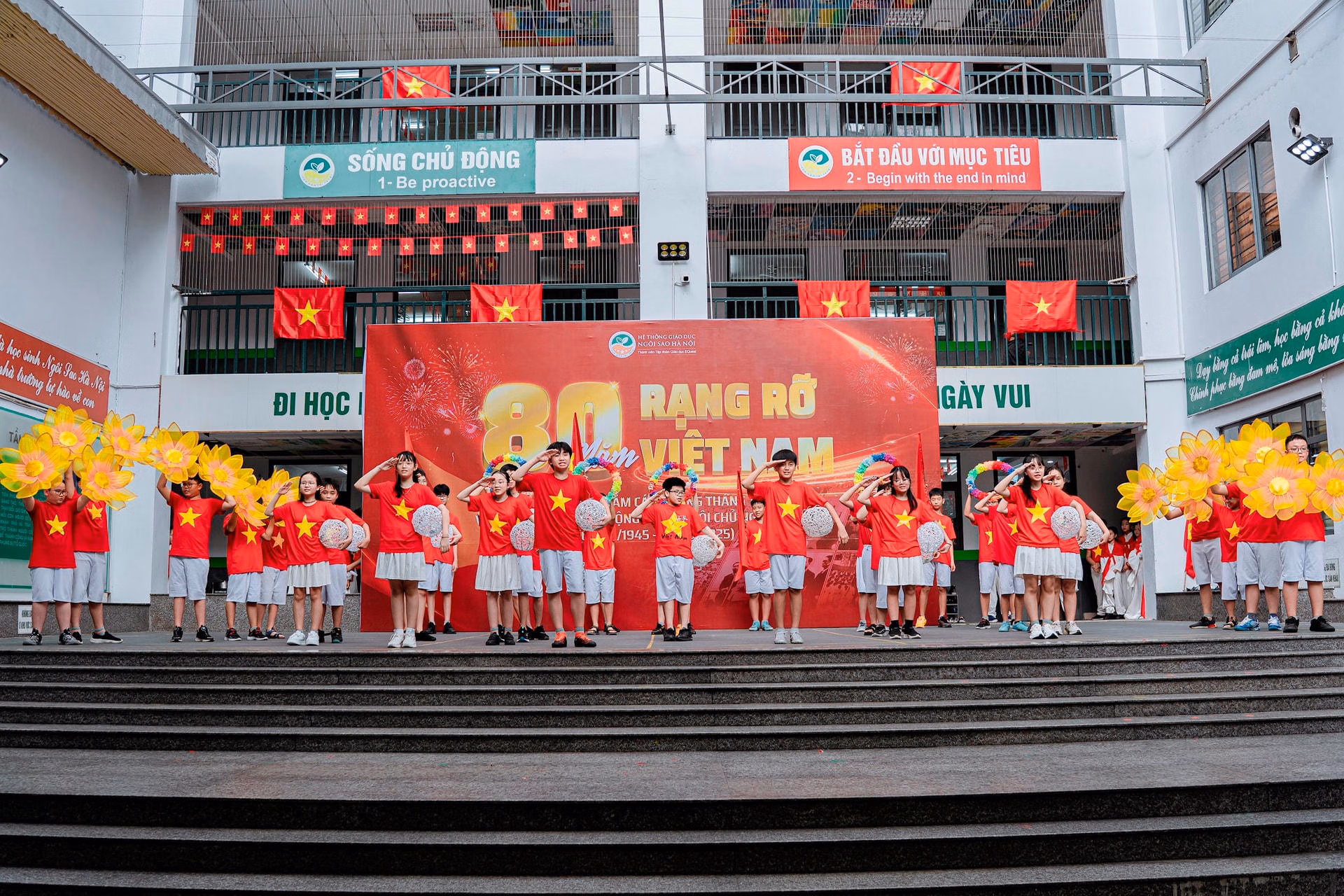 Một trong những khoảnh khắc ấn tượng và giàu cảm xúc nhất trong chuỗi hoạt động là màn đồng diễn của toàn thể học sinh toàn trường. Trong sắc áo cờ đỏ sao vàng rực rỡ, các em đã cùng nhau tạo nên những đội hình đẹp mắt, kết hợp với những động tác vũ đạo trẻ trung, sôi động nhưng vẫn tràn đầy tinh thần tự hào dân tộc. Toàn bộ sân trường như biến thành một biển đỏ rực rỡ, nơi những cánh tay giơ cao cùng nhịp vỗ tay, những bước nhảy đều đặn đã tạo nên bức tranh sống động, khẳng định tình yêu quê hương của thế hệ trẻ.
