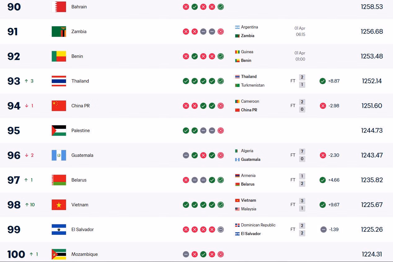 Trở lại top 100 thế giới, Việt Nam vẫn kém Thái Lan 5 bậc