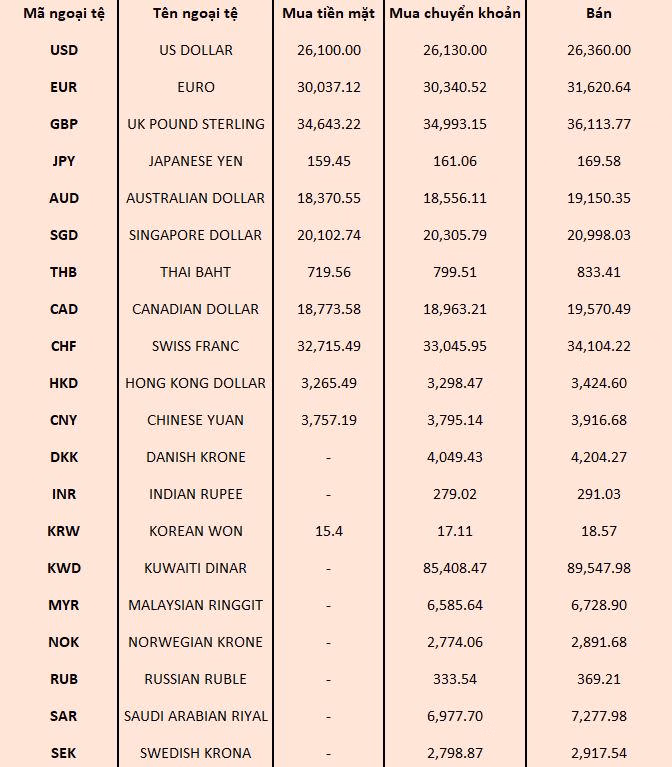 Cụ thể, đồng USD được niêm yết ở mức 26,100.00 đồng/USD (mua tiền mặt), 26,130.00 đồng/USD (mua chuyển khoản) và 26,360.00 đồng/USD (bán).