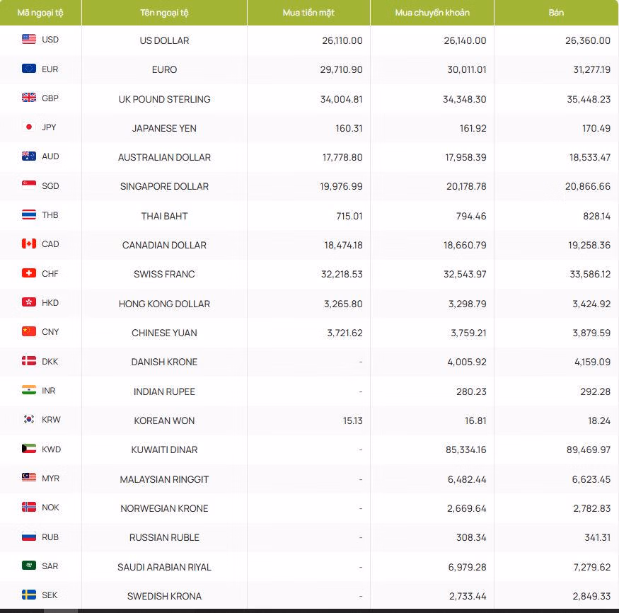 Đáng chú ý, nhiều đồng tiền không được niêm yết giá mua tiền mặt, chủ yếu giao dịch qua hình thức chuyển khoản như krone Đan Mạch (DKK), rupee Ấn Độ (INR), dinar Kuwait (KWD) hay krona Thụy Điển (SEK).