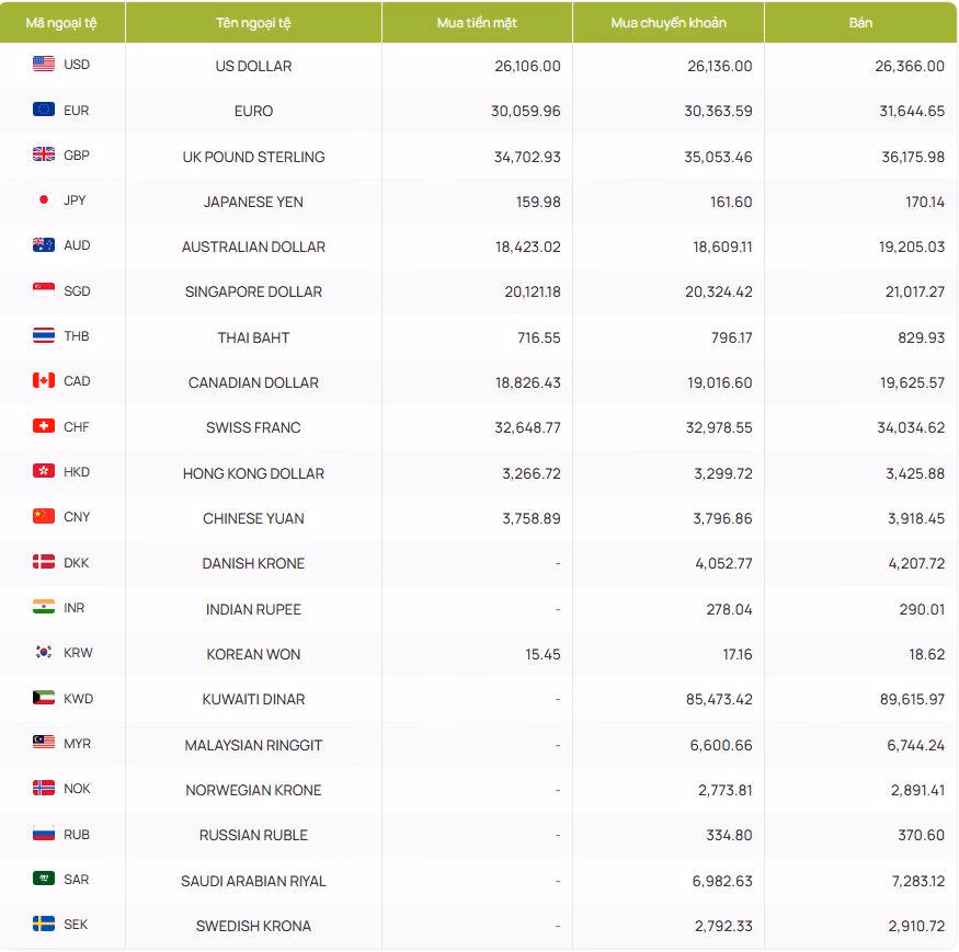 Theo bảng tỷ giá ngoại tệ ngày 29/4 được niêm yết tại Ngân hàng TMCP Ngoại thương Việt Nam, đô la Mỹ (USD) được giao dịch ở mức 26.106,00 đồng khi mua tiền mặt, 26.136,00 đồng khi mua chuyển khoản và 26.366,00 đồng ở chiều bán ra.