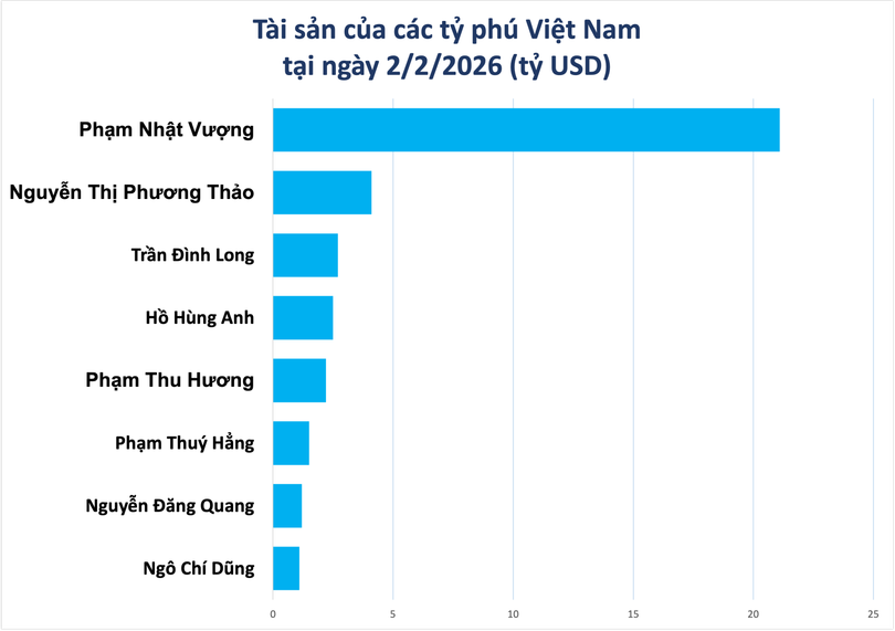Trong nhóm các tỷ phú mới, bà Phạm Thu Hương (vợ tỷ phú Phạm Nhật Vượng) là người có giá trị tài sản lớn nhất, đạt 2,2 tỷ USD, xếp hạng 1.790 thế giới. Bà Hương hiện là Phó Chủ tịch Vingroup, đồng thời là một trong những cổ đông lớn của tập đoàn khi trực tiếp nắm giữ hơn 341 triệu cổ phiếu VIC, tương đương khoảng 4,4% vốn điều lệ.